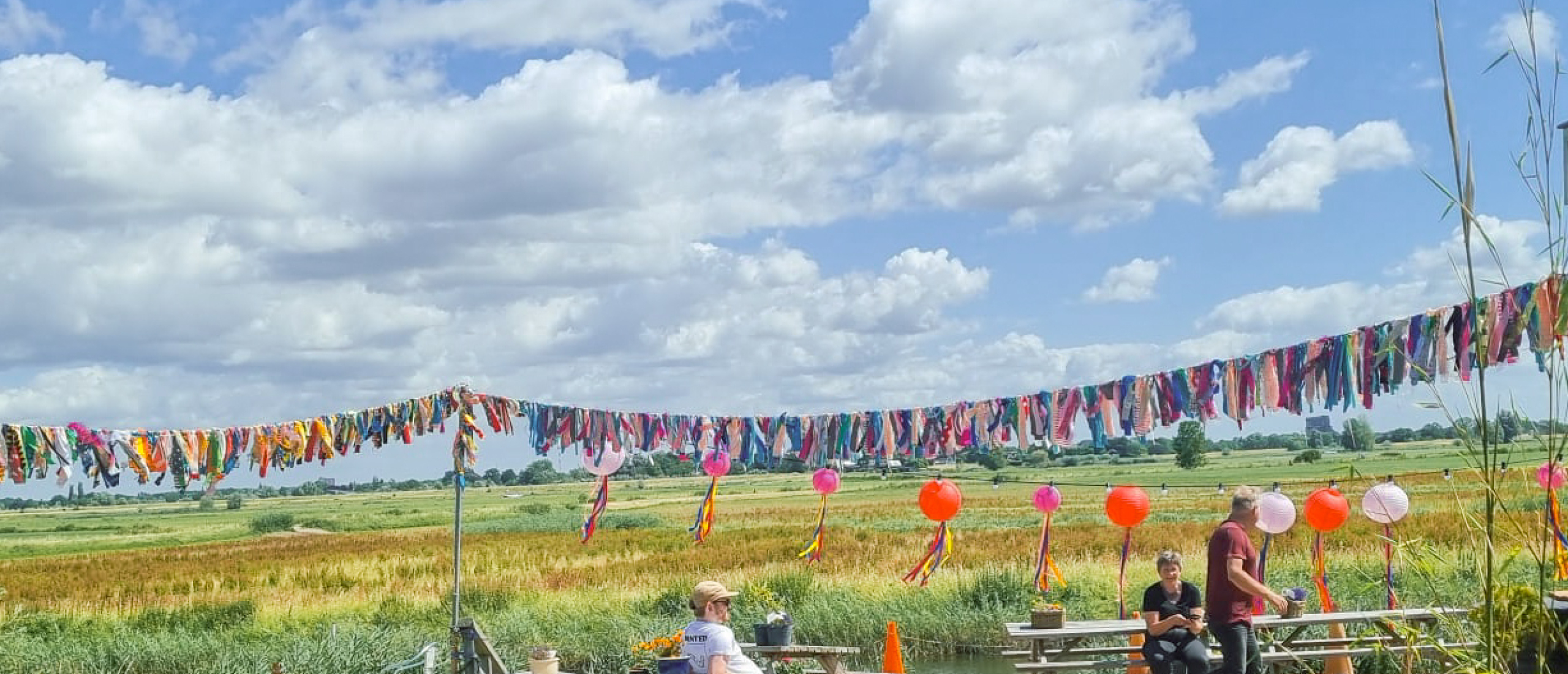 Stoffen decoratie maakt een terrein vriendelijker en warmer. Zeker bij buitenlocaties of grotere open plekken kan textuur veel doen. Denk aan bohemian festivalslingers van stof of kleurrijke repen die in de wind bewegen.