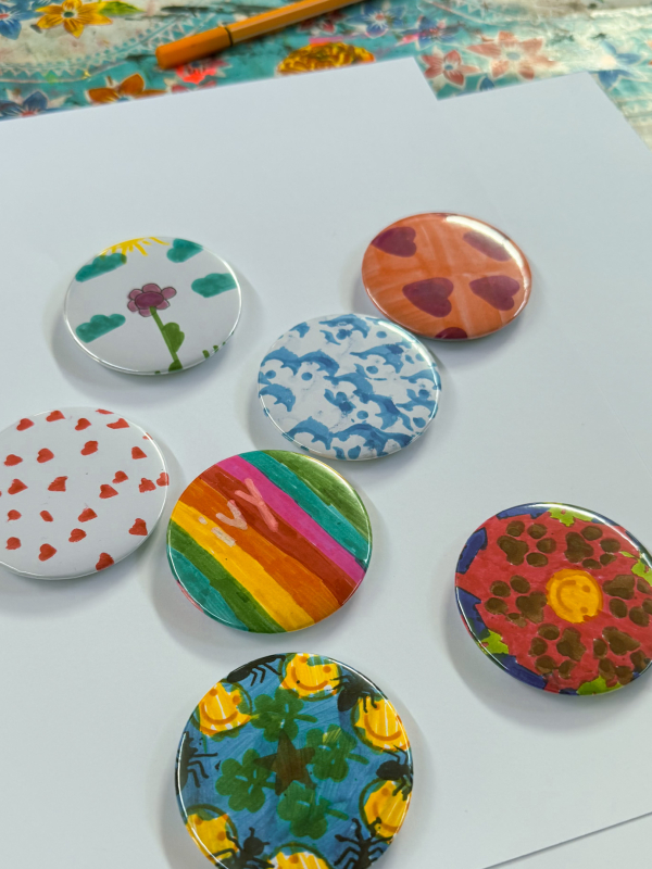 Het lijkt misschien eenvoudig, maar juist daarin zit de kracht. Kinderen tekenen of kleuren hun eigen ontwerp en zien het vervolgens ter plekke veranderen in een echte button. Dat directe resultaat maakt deze activiteit vrolijk, laagdrempelig en ontzettend aantrekkelijk.